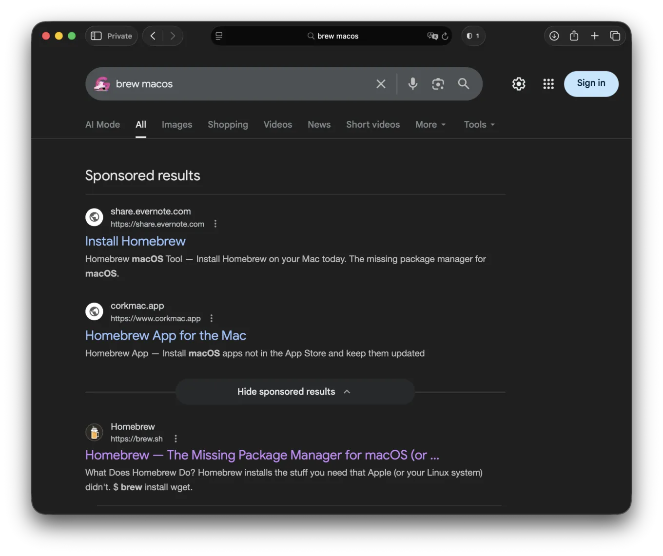 Der Angreifer kauft dann Google-Suchanzeigen, die auf Anfragen wie „brew macos“ oder „brew install“ abzielen.
