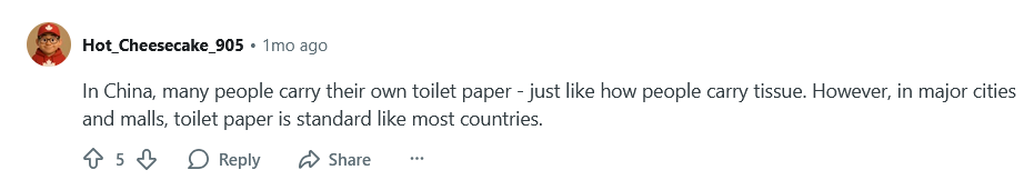 China Insider News itself notes that this practice isn’t common and does not name the exact location where it’s been implemented. Commentators on Reddit were quick to point out that, while the setup may seem dystopian by Western standards, it’s not necessarily out of step with local norms. “In China, many people carry their own toilet paper — just like how people carry tissue,” one Redditor explained. “However, in major cities and malls, toilet paper is standard like in most countries.”