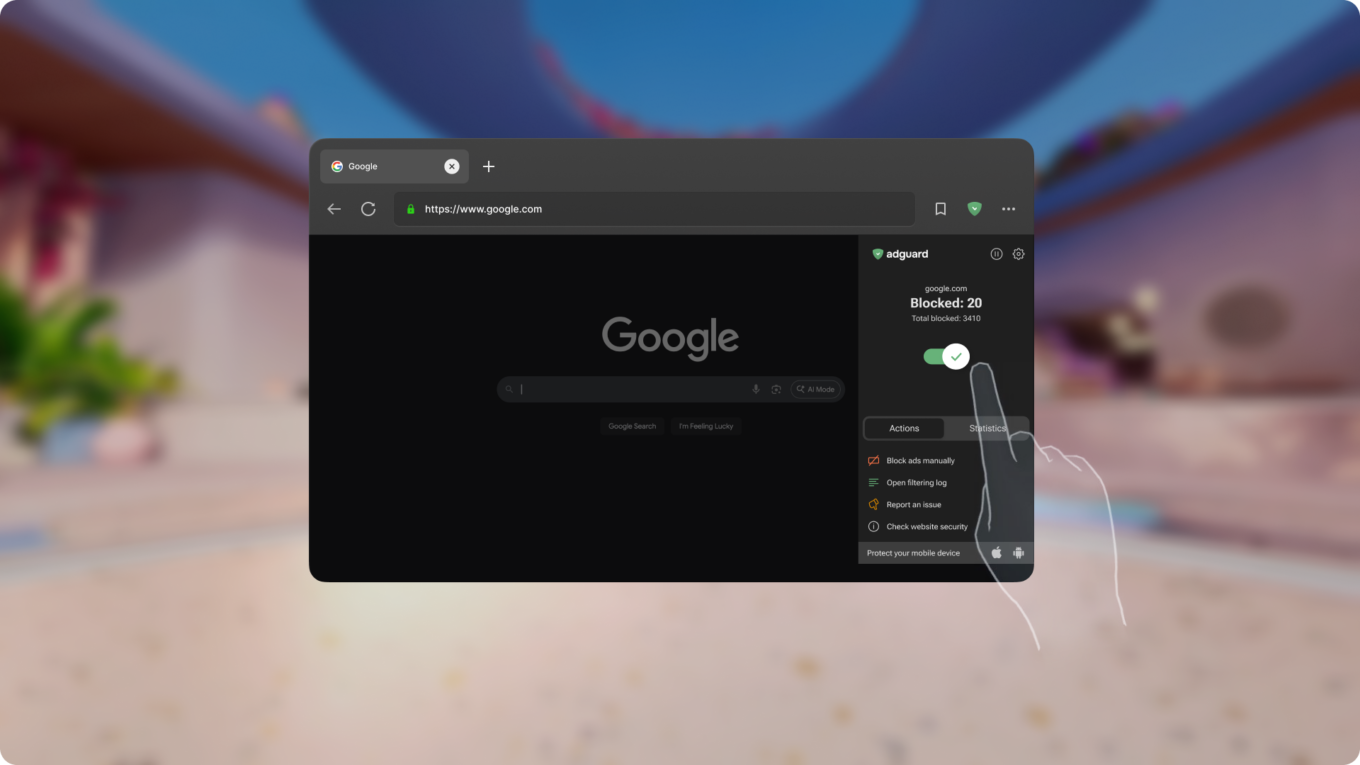 AdGuard for Meta Quest works just like our browser extension for Chrome: it blocks ads, trackers, pop-ups, and malicious websites, giving you a cleaner, faster, and more private web experience. Whether you're reading, shopping, or exploring online in your Meta Quest headset, AdGuard helps you stay focused and in control. AdGuard works on Quest 2, Quest Pro, Quest 3, and Quest 3S.