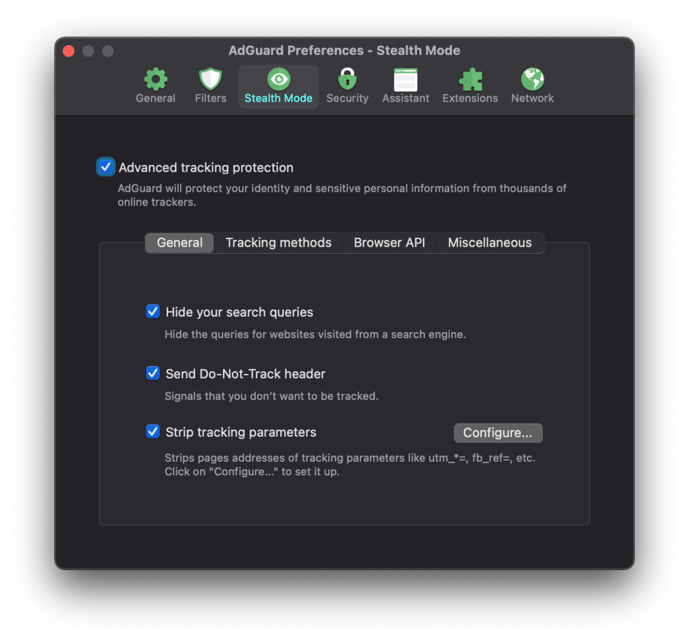 Stealth Mode contains a wide range of options, which ensure its flexible configuration. They are divided into several categories, and for an unprepared user many of them will seem confusing and maybe even complicated. We provided each option with a hint to make up for the deficiency — hints appear when you hover over the icon with a question mark. If you still wish to know more about the whole concept, we encourage you to proceed to this Knowledge Base article like a true privacy geek probably would.