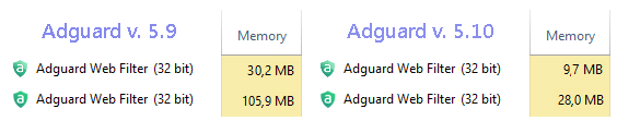 We have significantly optimized memory usage in 5.10. Now, even if you use an old computer or a weak netbook, Adguard will work silently in a background without slowing down your device. We compared memory footprint with the one of the preceding version. And we must say 5.10 showed a result several times lower.