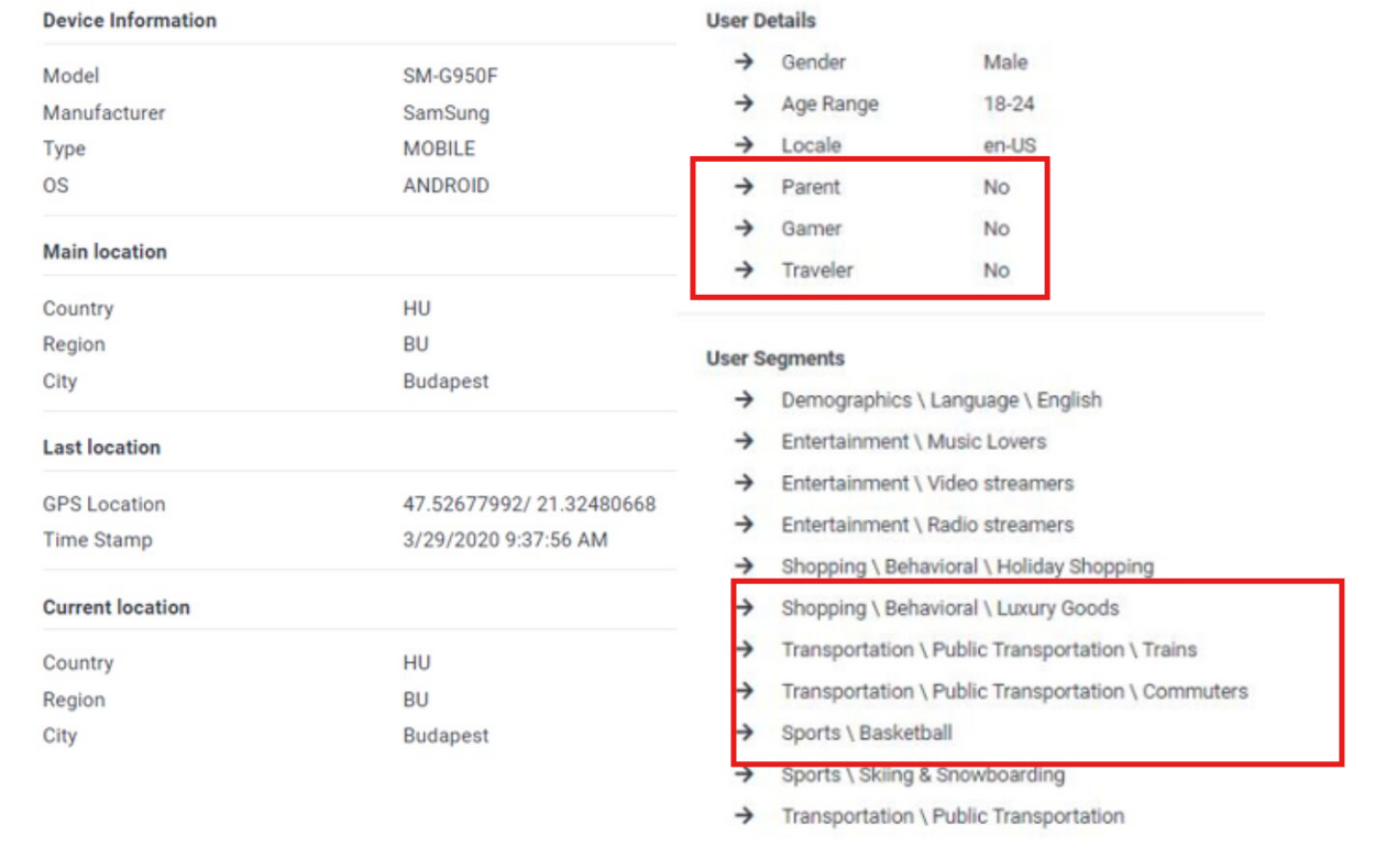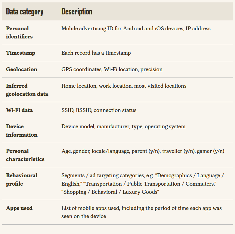 On top of this, ad-tech systems can sometimes add guessed attributes like age range, gender, and behavioral categories (for example that a person is into ‘luxury shopping’). These are not taken directly from the device, but inferred through advertising models and then linked back to device IDs.