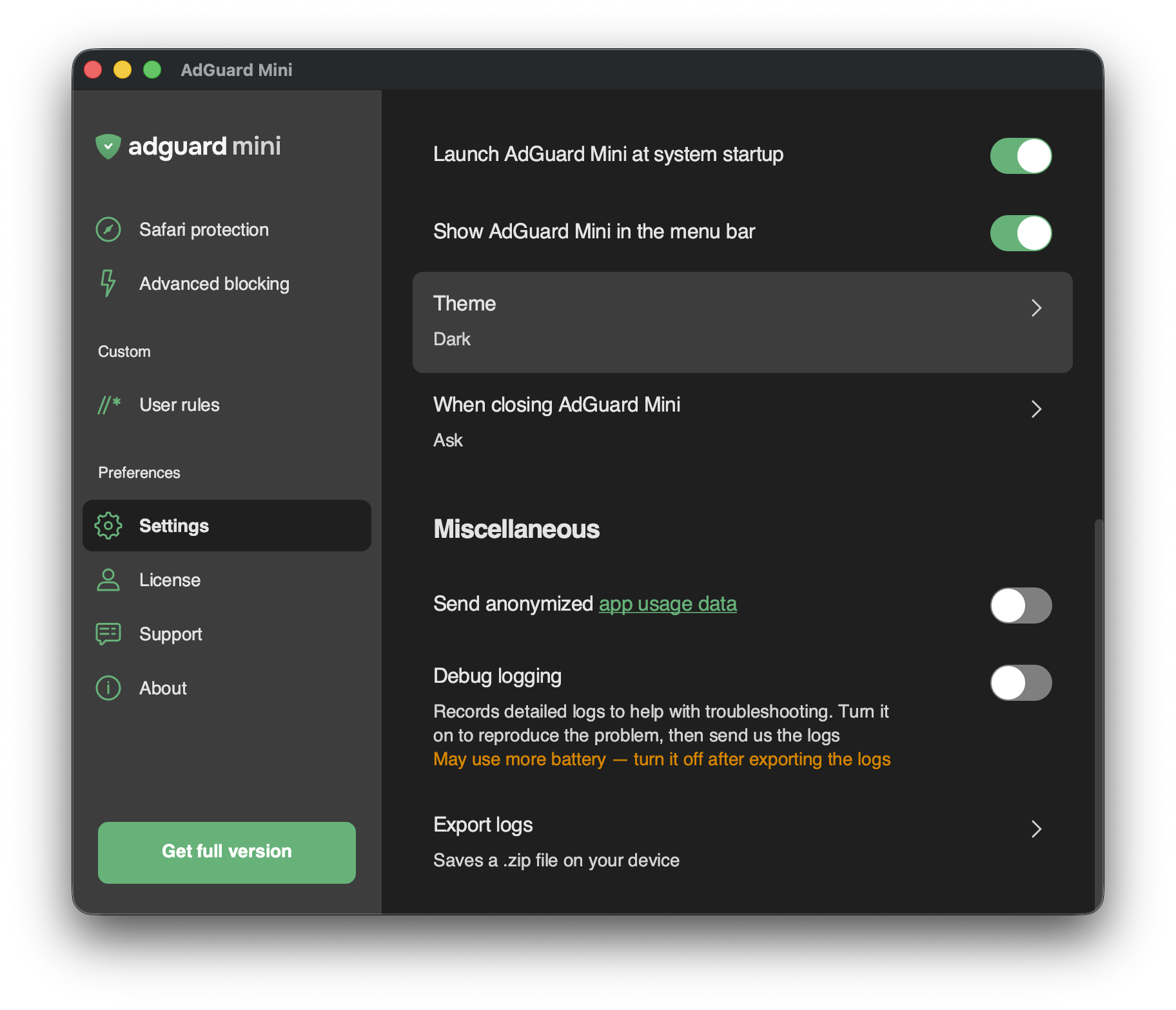 Esta función está destinada a aquellos que quieren que la aplicación AdGuard Mini tenga un tema claro o oscuro, independientemente del tema actual del sistema. Elige entre tres opciones y disfruta de más flexibilidad en la apariencia de la aplicación.