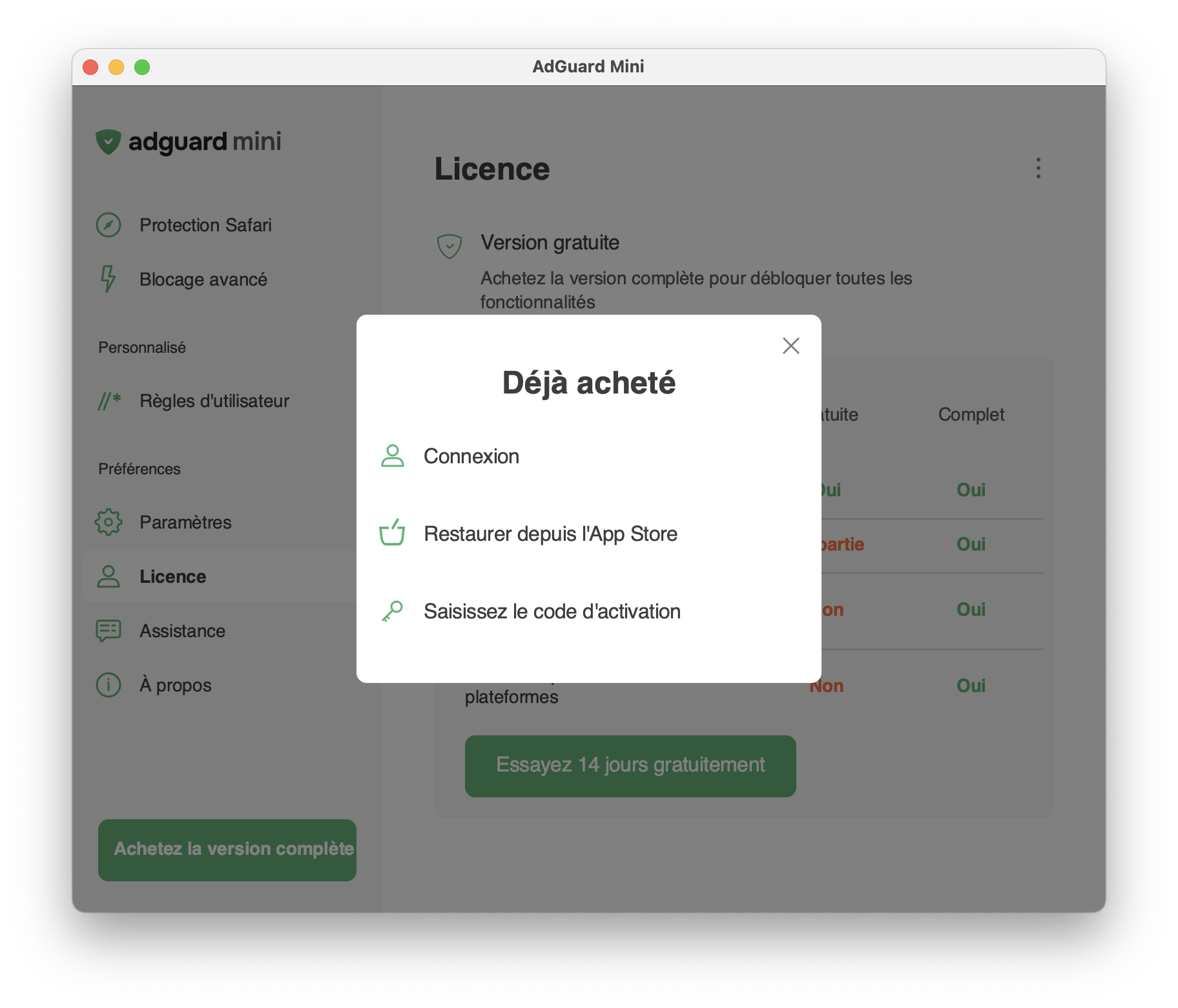 Veuillez noter que seuls les abonnements achetés dans l'App Store pour iOS ne peuvent pas être utilisés dans AdGuard Mini pour Mac.