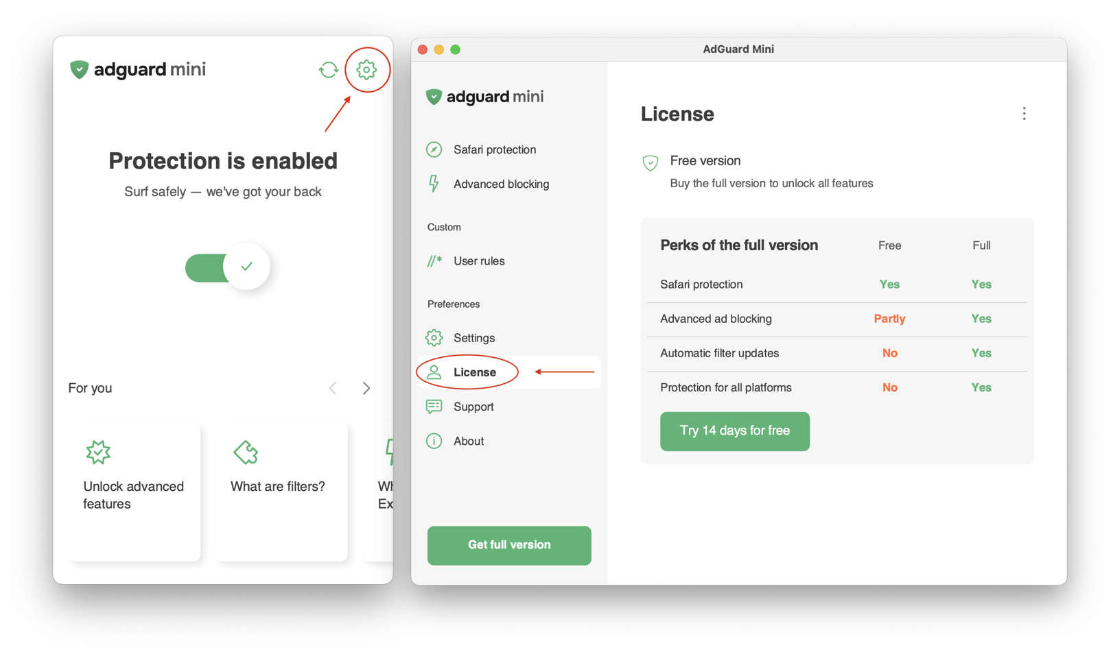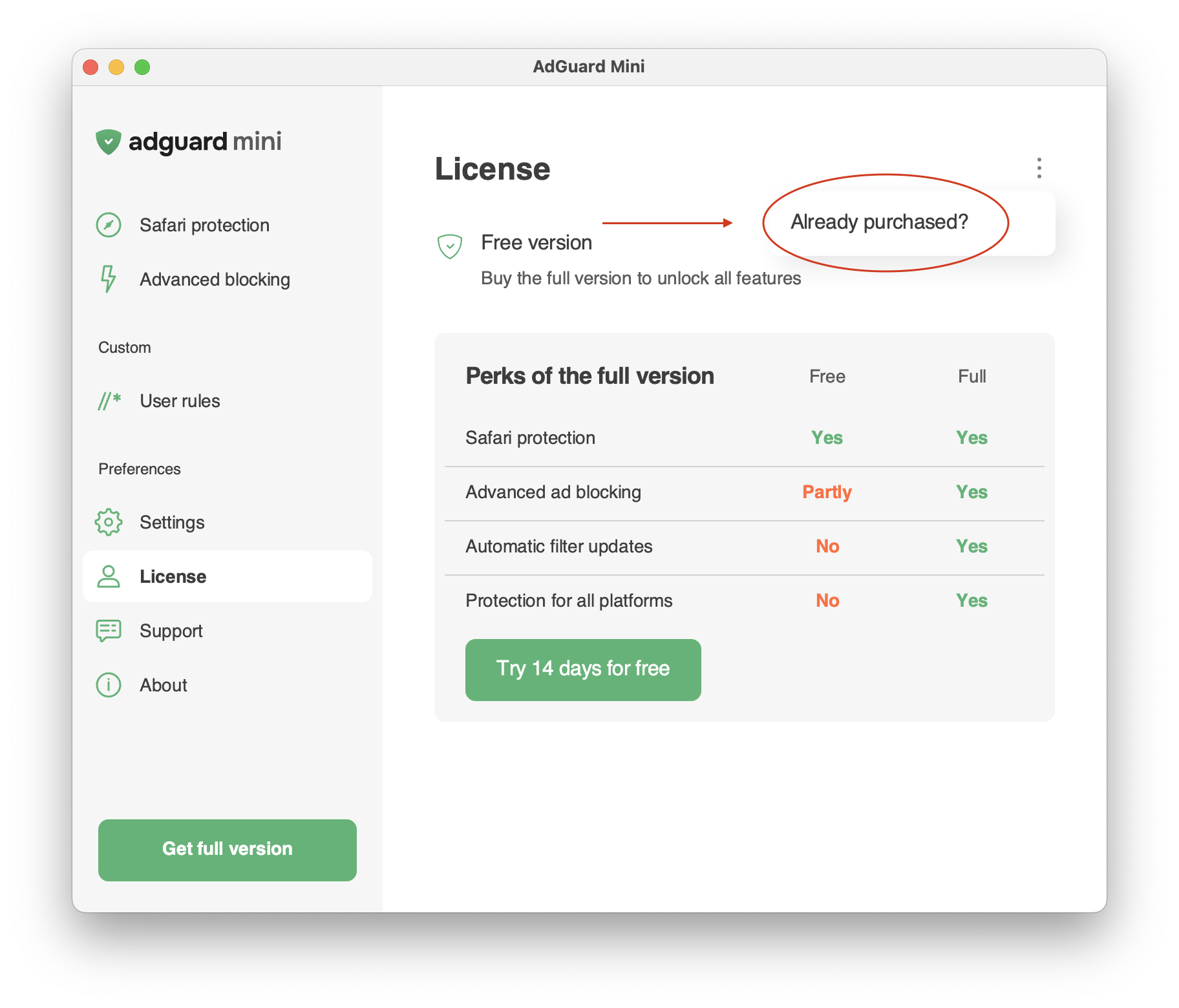 Apri AdGuard Mini → Impostazioni → Licenza.