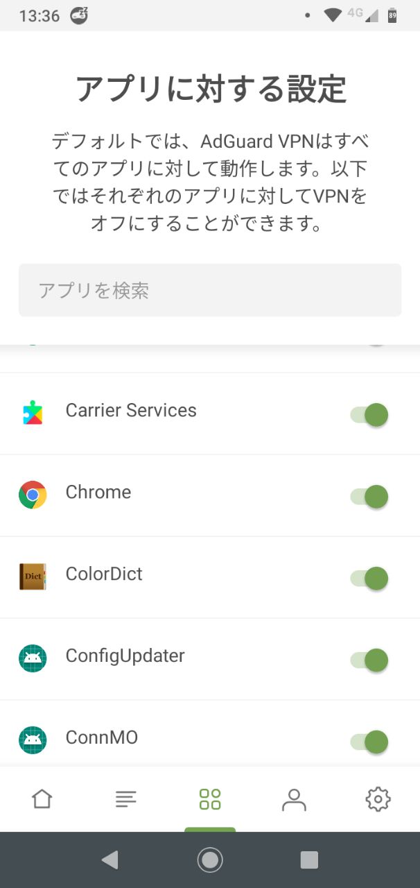 対象外にしたいアプリを見つけてタップして、AdGuardによる保護をオフにしてください。