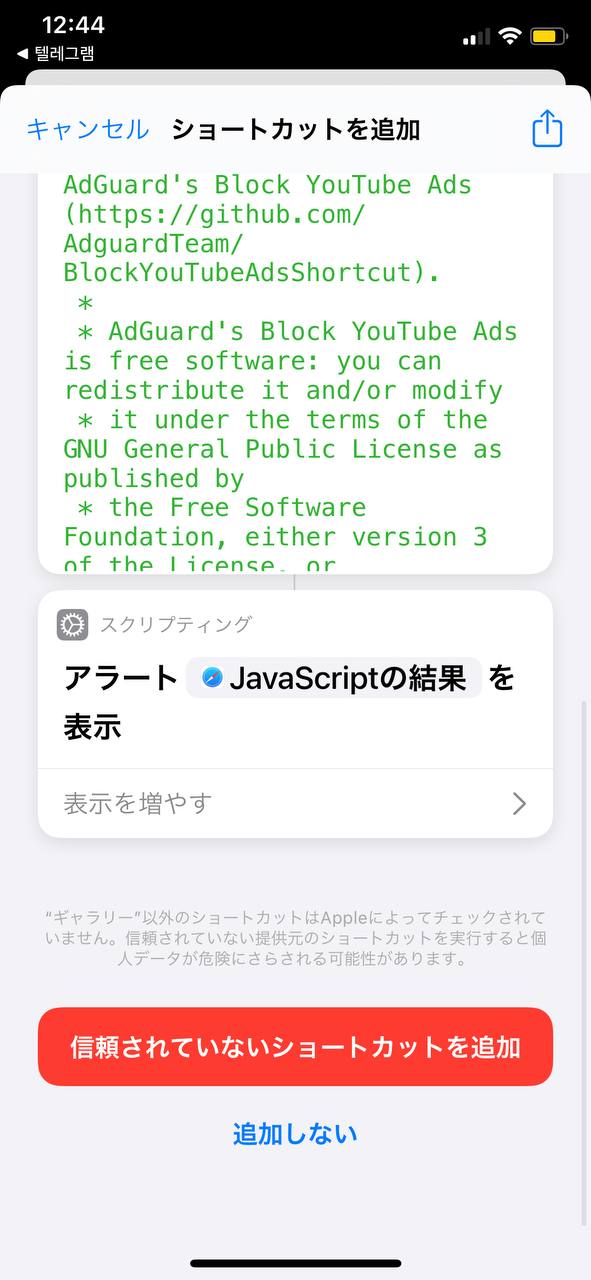 - このリンクへ進み→「ショートカットを追加」を押す→開いた画面で下までスクロールして「信頼されていないショートカットを追加」を押す