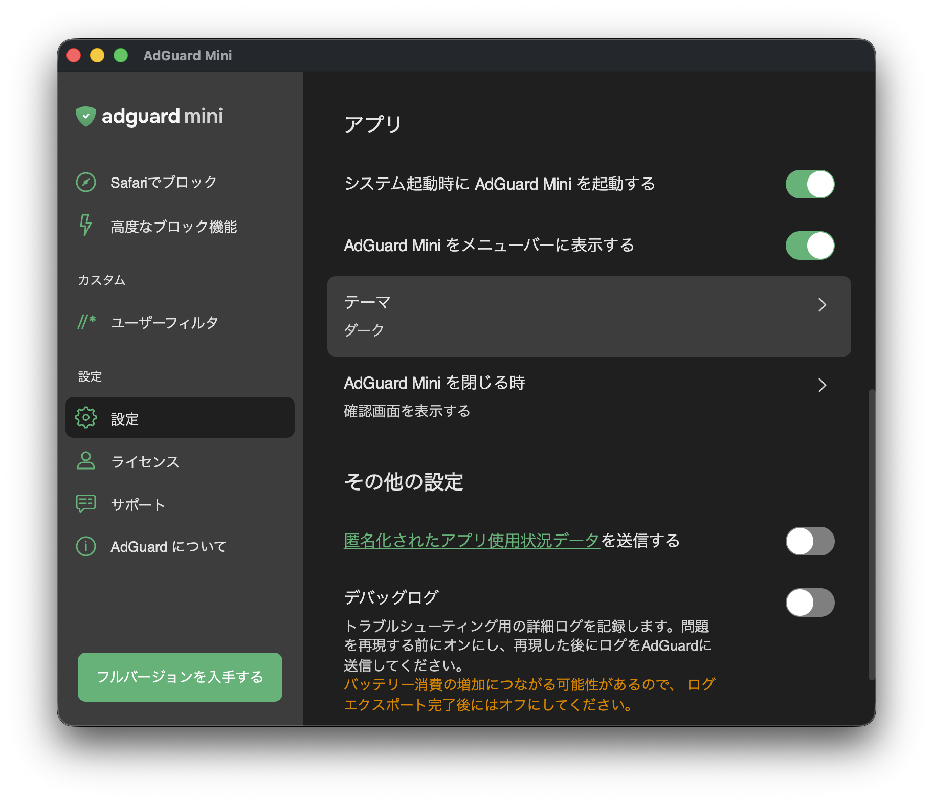この機能は、現在のシステムテーマに関係なく、AdGuard Miniアプリをライトテーマまたはダークテーマで利用したいユーザー向けです。3つのオプションから選択し、アプリの見た目をより柔軟にカスタマイズできます。