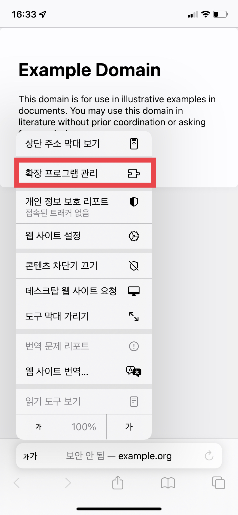 - 목록에서 확장 프로그램 관리 옵션 선택