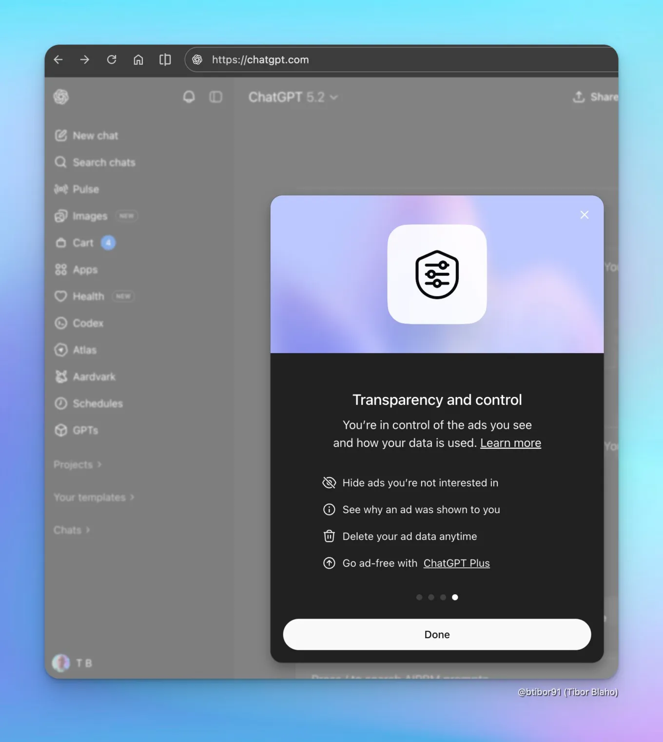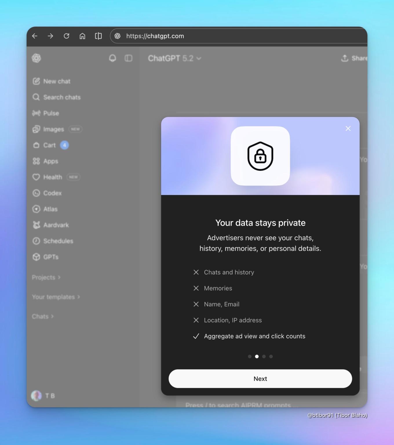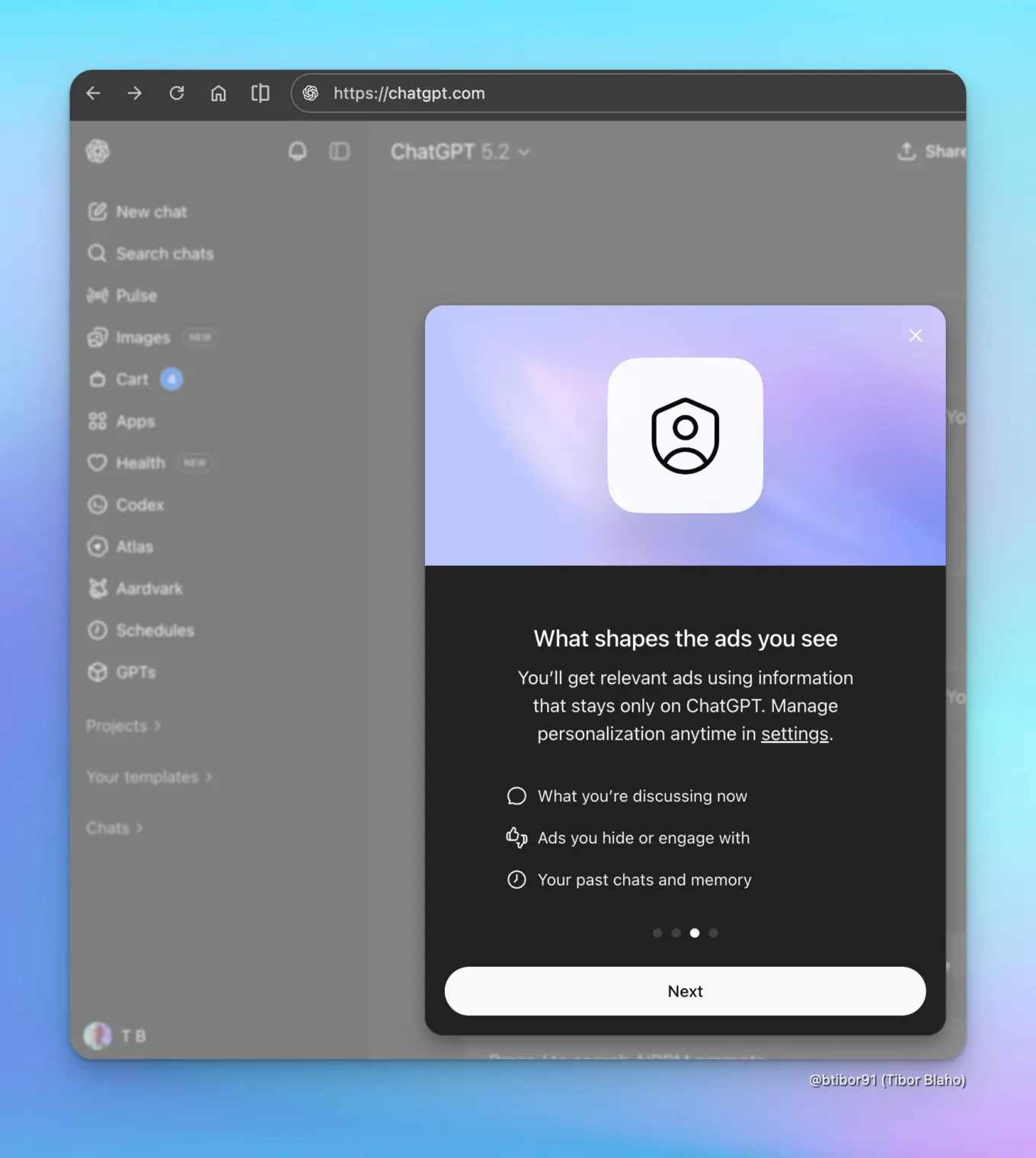 온보딩 화면에서는 사용자가 보게 될 광고의 종류와 그 이유를 설명하고, 광고 제어 기능을 안내하며, 무엇보다도 챗봇의 응답 자체가 광고주의 영향을 받지 않을 것임을 안심시켜 줍니다.