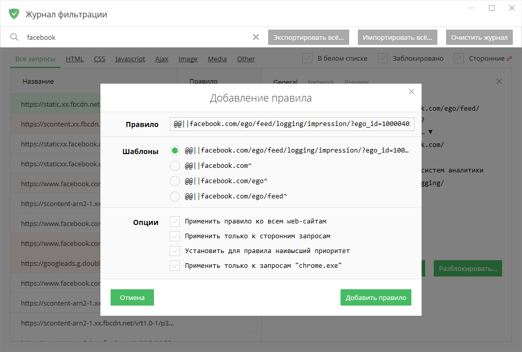 Мы совершенно точно знаем, что многие наши пользователи активно пользуются журналом фильтрации — как для создания новых правил, так и для общих целей. Так почему бы не помочь им в этом? Журнал фильтрации претерпел серьезное обновление. Его новая версия во многом пересекается с редактором фильтров, например, вы можете создавать новые правила и разблокировать заблокированные запросы прямо из него.
