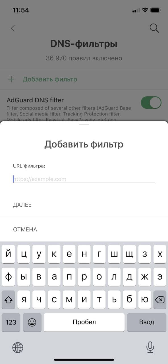- Добавить DNS-фильтр, например, AdGuard DNS filter.