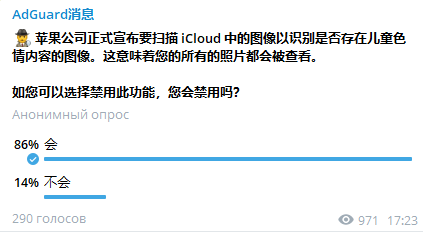 根据上述所讲的解释了我们为什么要绞尽脑汁,思考能够让用户管理苹果分析他们图片的方式。在我们的社交媒体账号我们发起了投票。绝对多数的成员(大概 86%)想要禁用 CSAM 扫描。我们不相信所有投票的人都虐待儿童。他们只是能看到潜在的风险。
